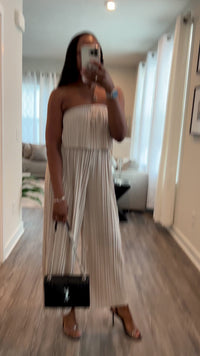 Effortless ease meets refined sophistication. This strapless pleated jumpsuit flows with movement, offering a chic silhouette that transitions seamlessly from day to night.